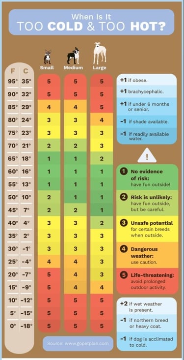 Potential Risk: Above 20°C, with higher risks for young, elderly, obese, brachycephalic dogs, or those with health problems